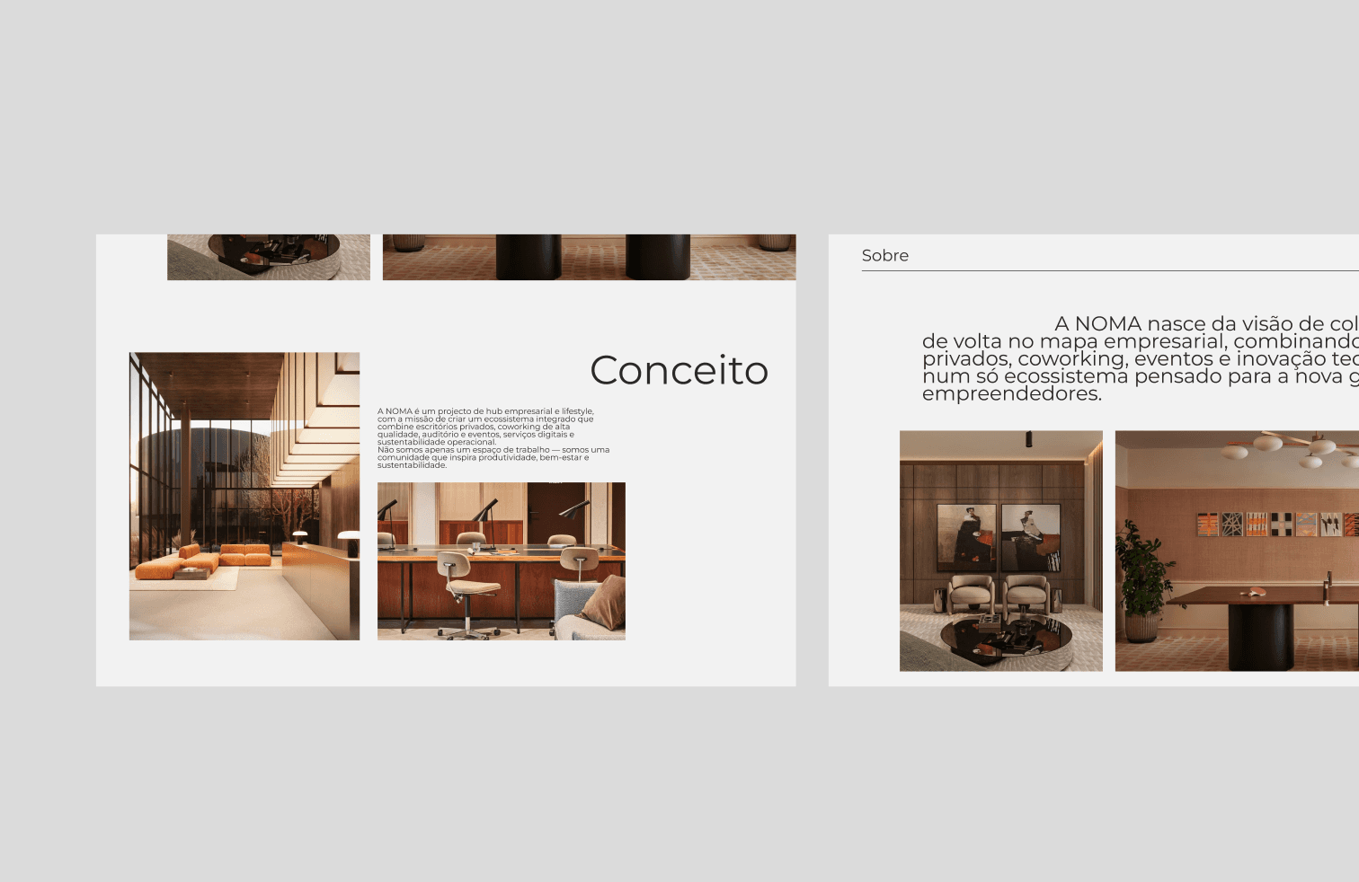 NOMA is a contemporary workspace concept designed to bring a new entrepreneurial culture to Coimbra. The brand blends architecture, technology, and community into a multifunctional ecosystem of private offices, coworking areas, event spaces, and a curated café experience.